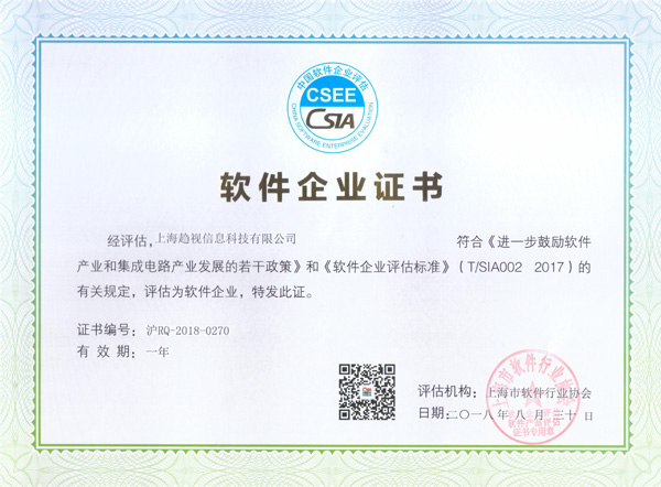 根據《進一步鼓勵軟件產業和集成電路產業發展的若干政策》(國發〔2011〕4 號)、《軟件企業評估標準》(T/SIA002-2017),2018年8月,經審核,我司獲得軟件企業評估認證。